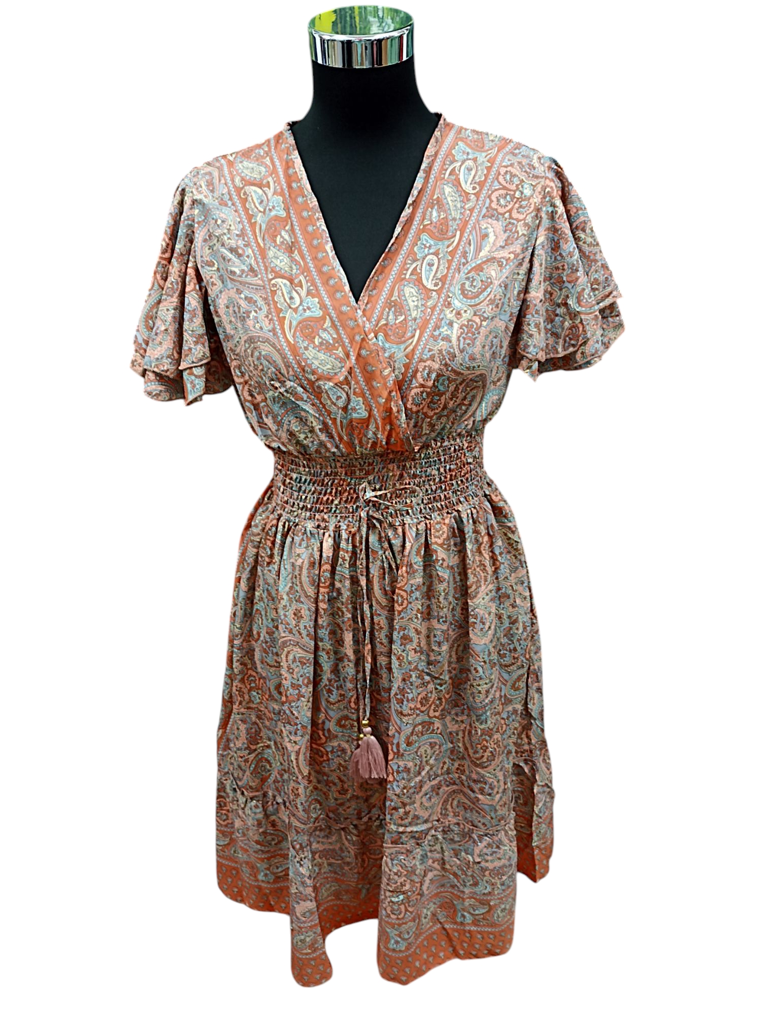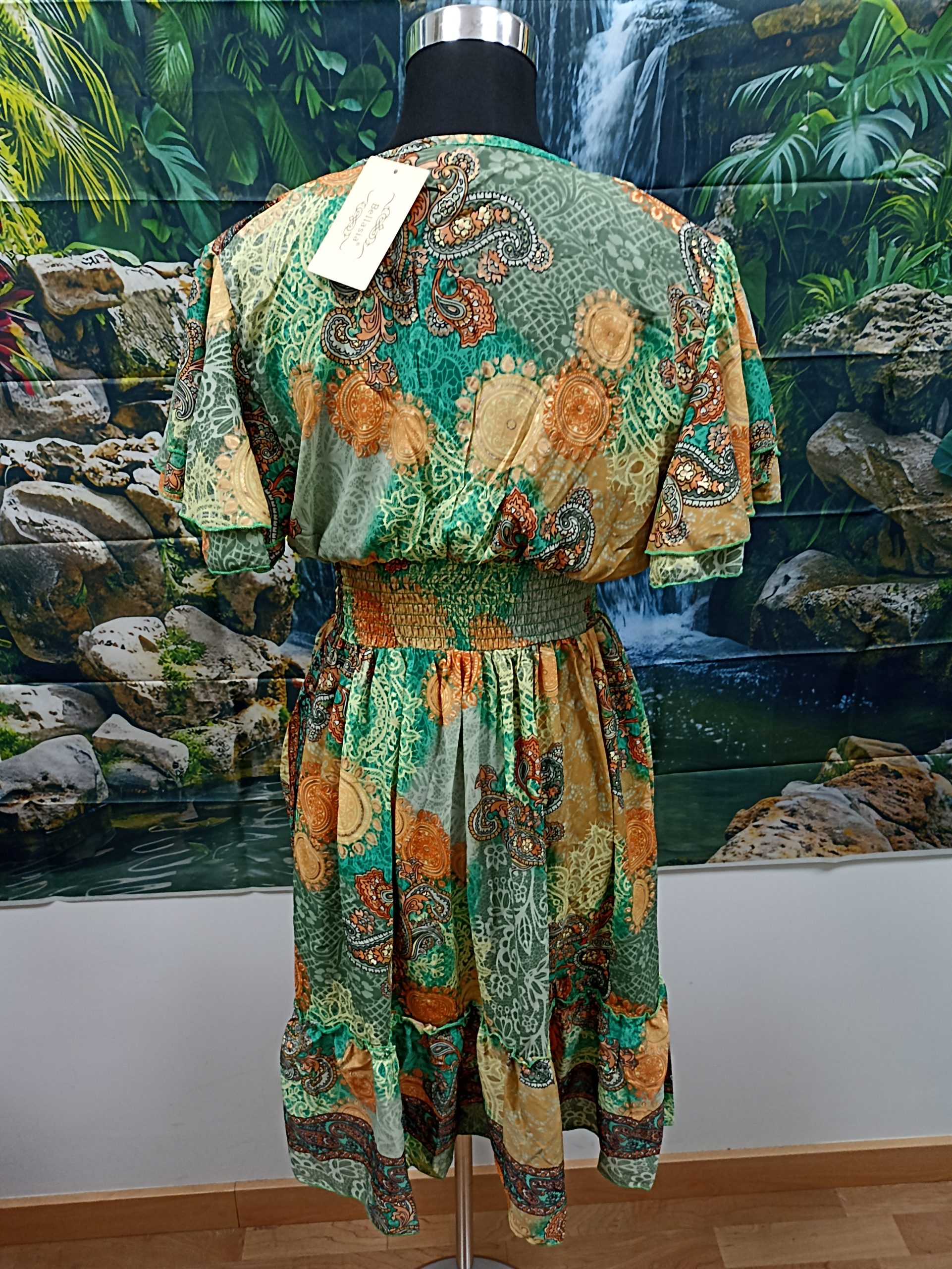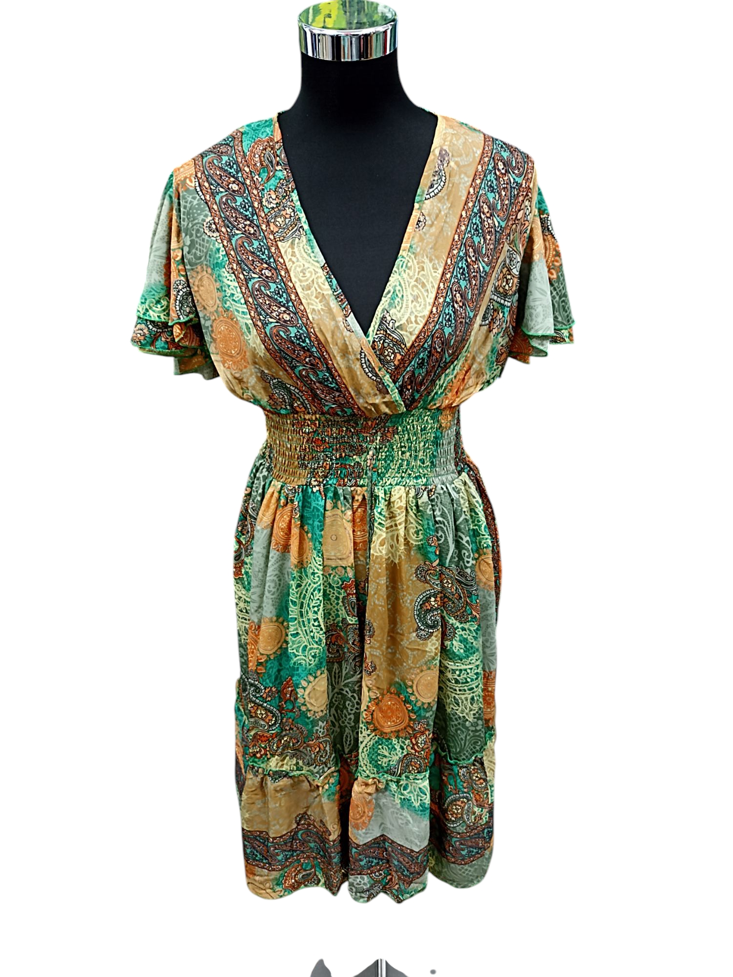 VESTIDO DE ESCOTE PICO CON LA CINTURA ELASTICA. MATERIAL SILKY/POLI.FABRICADO EN INDIA.