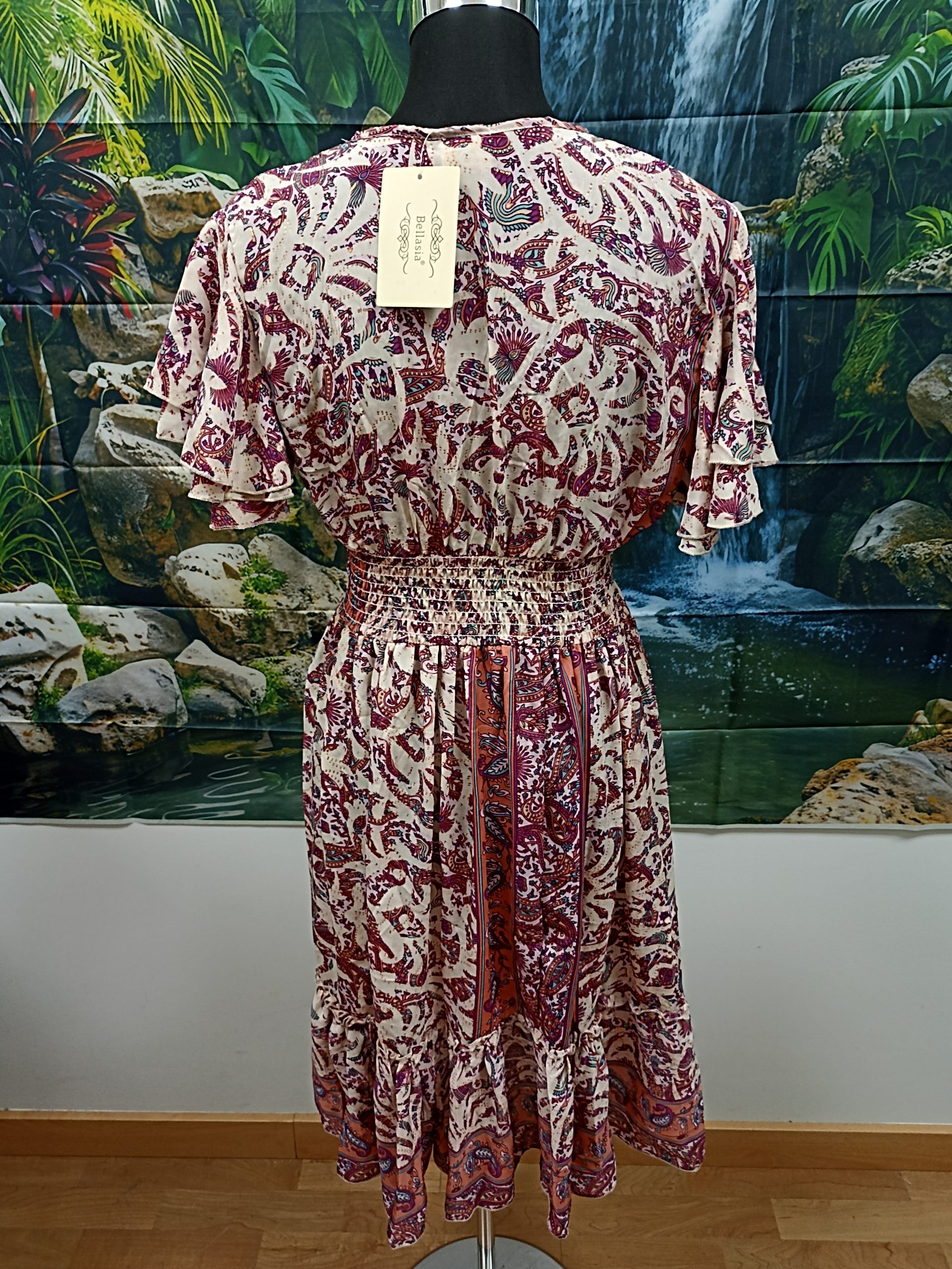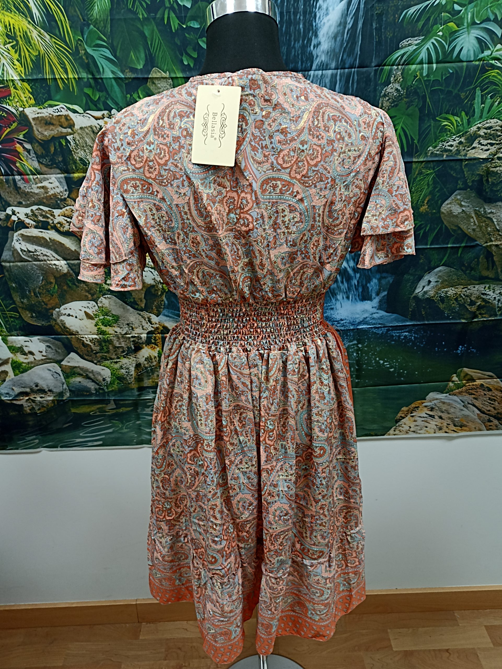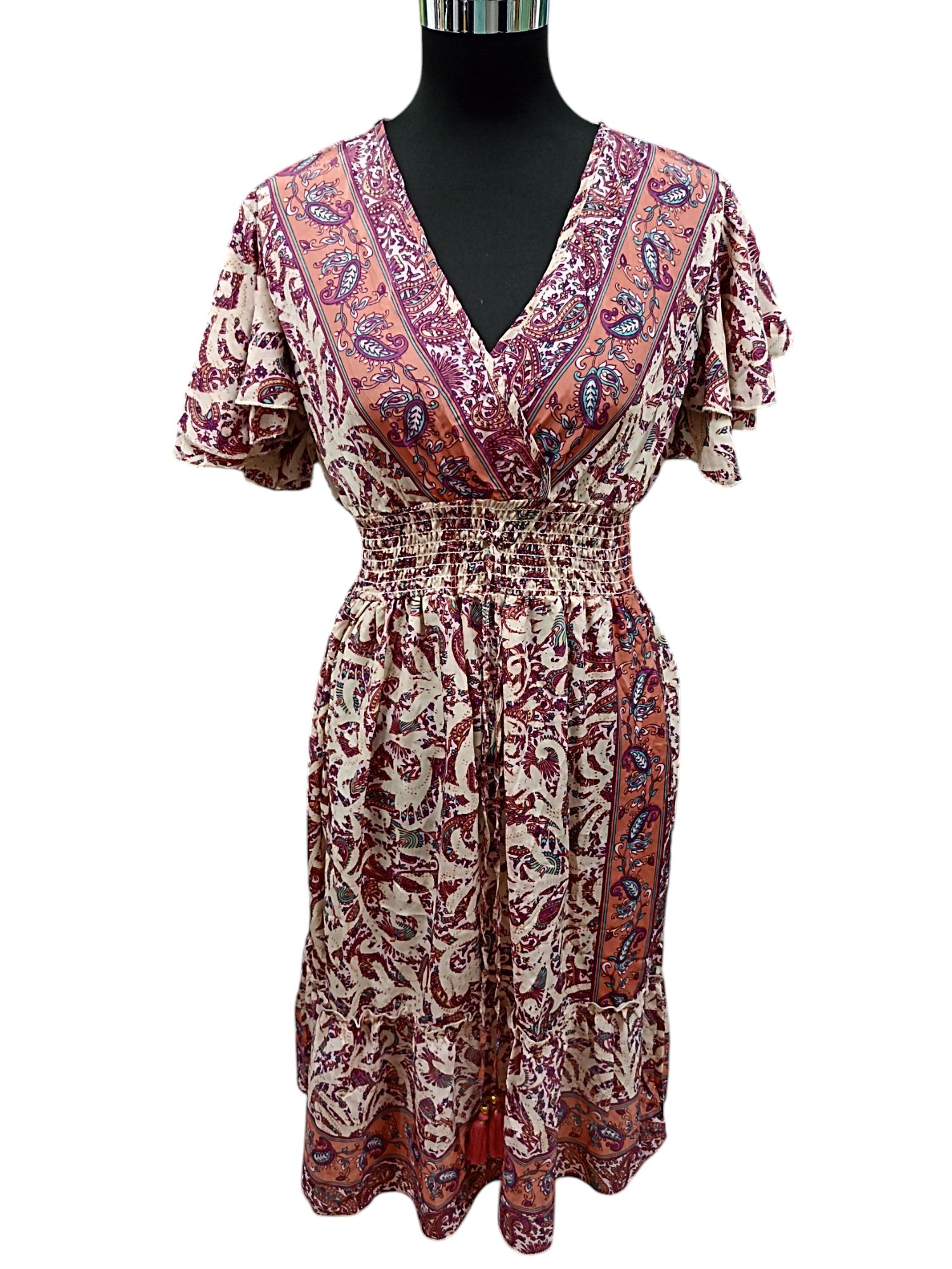 VESTIDO DE ESCOTE PICO CON LA CINTURA ELASTICA. MATERIAL SILKY/POLI.FABRICADO EN INDIA.